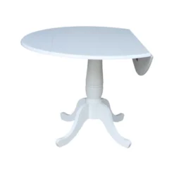 International Concepts home furniture is for those who appreciate high quality, wood furniture with a traditional and elegant look. This piece will beautifully complement your kitchen or dining room. This three piece set includes 1 dual drop-leaf dining table and 2 chairs. The table measures 42″W x 42″D x 29.5″H. It has a 9″ drop leaf on each side, with a 24” x 42″ center piece. It has a pedestal base with four feet for maximum support. The solid wood chairs measure 17″W x 21.25″D x 36.02″H with a 17.7” seat height. They feature box seat construction for easy assembly. The set is made of solid hardwood with a butcher block top design. It has a dual-toned hickory and stone finish, and ships ready to assemble.