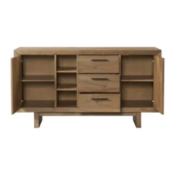 Display and organize a wine collection in style with this sophisticated wine bar table with storage. This rustic, buffet-style cabinet features 4 rows of racks to keep up to 28 bottles of wine neatly organized and a flat, tabletop surface that is great for serving food and drinks. Made from solid pine, this sturdy drawer wine rack can support up to 130 lbs overall. Each row can hold seven bottles and support up to 45 lbs. The zinc alloy drawer pulls and two-tone design give this unique cabinet an antique appearance. Plus, it features beautifully molded details that will complement a variety of decor styles and furniture pieces. The farmhouse bar cabinet features two convenient drawers for additional storage. Each drawer is capable of supporting up to 30 lbs and provides a convenient place to store corkscrews, wine charms, coasters, and other accessories. This stylish wood wine rack cabinet is a lovely addition to the kitchen, dining room, or home bar.